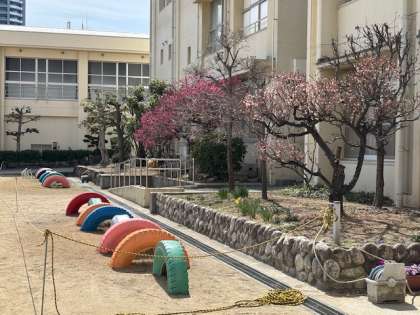 梅と桃の花が咲いています。毎日鳥が飛んできています。