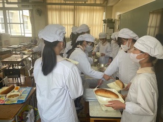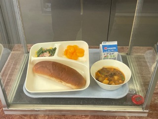 本日の給食は、黒糖パン、ビーフシチュー、ベーコンとサンド豆のソテー、みかん(かんづめ) です。