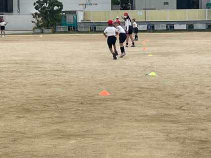中: 4-2がバトン練習をしていました。どうすればうまくいくか話し合いながら工夫して反復練習をしていました。