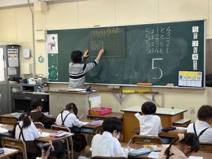 上: 1年生がいくつといくつで5ができているか。5の合成・分解を学習していました。