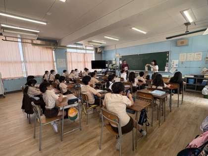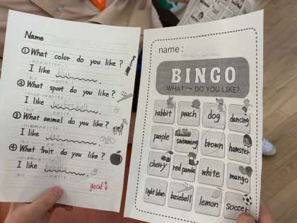 5年生の外国語(英語)の学習の様子です。「何が好きですか」と英語でお友だちに質問して、自分が考えた答えをビンゴカードに記入していて、ビンゴになるまで相手を変えて質問をするというゲームをしていました。なかなか発音が良かったです。