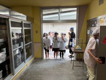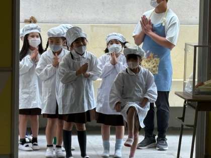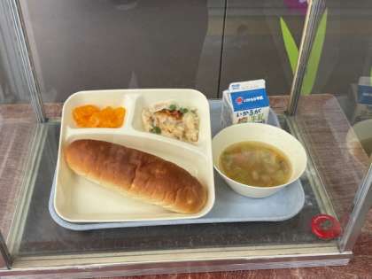 本日の献立は、おさつパン、マカロニグラタン、ウインナーとキャベツのスープ