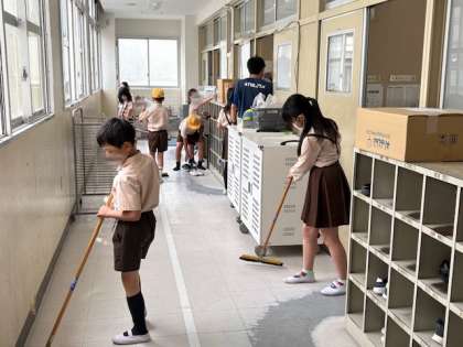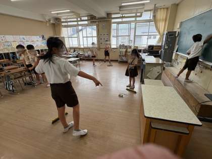 お昼休みと清掃の時間です。休み時間の終わりのチャイムがなると、全力疾走で教室に向かいます。
