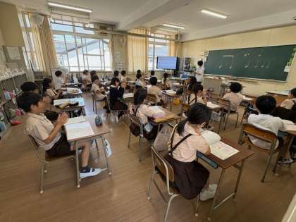 中: 4年生が音楽の学習で、複雑なリズムを手拍子で練習していました。