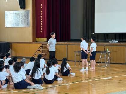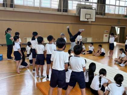 講演では、基本の大切さや緊張感のある場面での考え方などを具体例をあげて説明いただき、実技指導では、前転、後転、側転をご指導いただきました。最後は、北京オリンピック銀メダルをみせていただきました。楽しく色々と学ばせていただきありがとうございました。