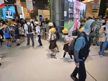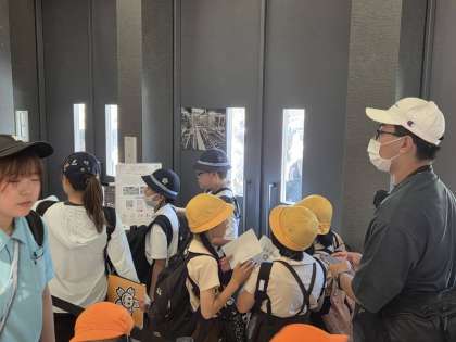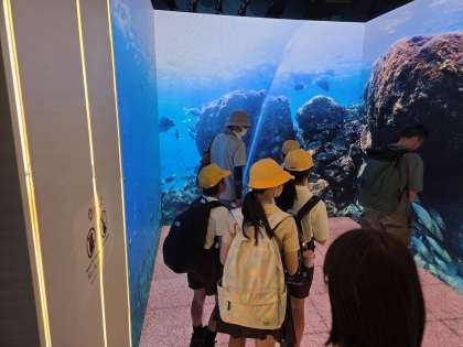 4年生です。コモンズ館を体験しています。班行動をしていて、班で相談して色々な国の展示を観覧しています。