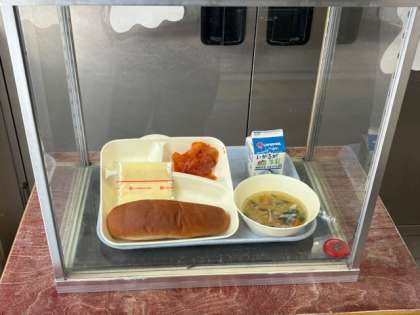 本日の献立は、えびのチリソース、中華スープ、スライスチーズ、黒糖パン、牛乳です。
