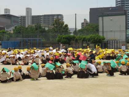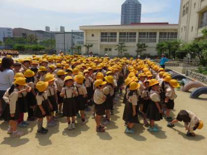 5月23日月曜日、鶴見小学校は創立60周年を迎えました。この日を記念して、全児童と教職員が参加する航空写真を3時間目に行いました。