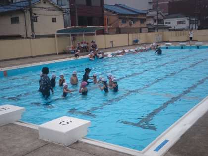 いつ雨が降りだすか、心配でしたが、水の中で目を開けたり、ビート板につかまったりしました。