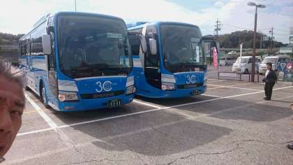 写真は今回の修学旅行でお世話になるバスです。2号車には1組が、1号車には2組が乗車しています。