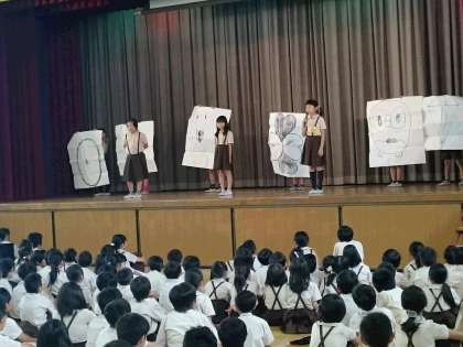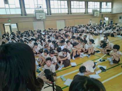 キッズファミリーで決めるために、体育館でPR集会を開きました。