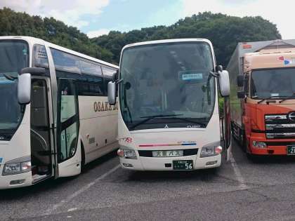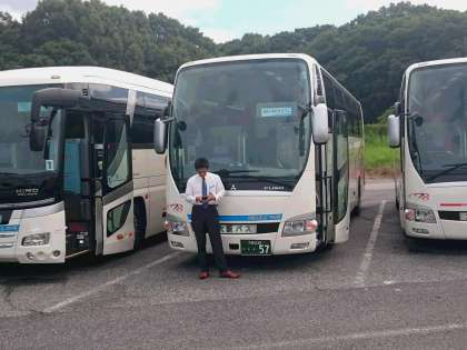 今回の林間学習でお世話になっているバス会社です。安全運転で子どもたちをハチ高原グリーンロッジまで搬送してくださいます。写真左側のバスが1号車で2組が乗車、右側のバスが2号車で1組が乗っています。