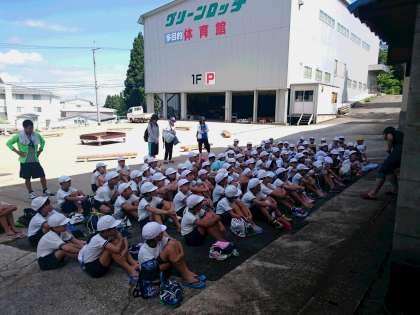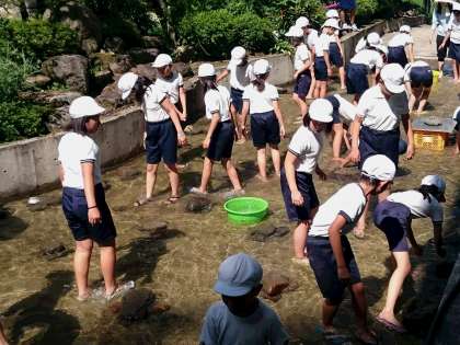 さて、林間学習1日目午後のプログラムである魚つかみですが、ヒグラシの鳴き声のなか、宿舎の方から説明を聞いた後、1組と2組に分かれて魚つかみにチャレンジしました。アマゴが放流されると、追い詰めることはできるのですが、なかなかゲットすることはできませんでした。つかまえたアマゴはみんなでいただきました。
