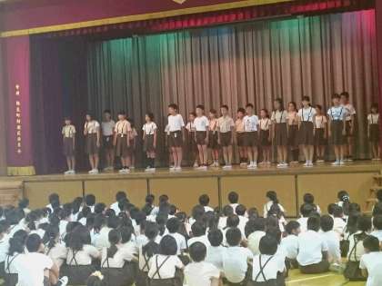 今日(9月28日)の児童集会で、後期代表委員に選出された児童が、講堂の舞台に立って、自己紹介と決意表明をしました。