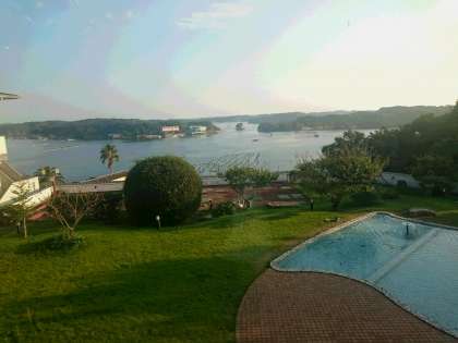 今、ホテルの前には、美しいあご湾の風景が広がっています。