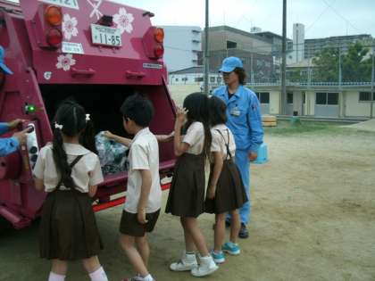 5月15日(木)の2、3時間目、校庭で「パッカー車の出張授業」がありました。