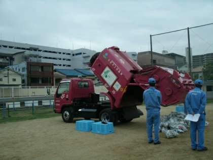 始めに先生から、「城北センター」の職員の方々の紹介があり、その後、パッカー車の説明と操作の実演が行われました。