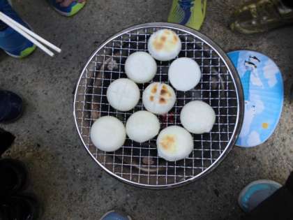 炭に種火が移ると、七輪に網をのせお餅を焼きました。裏返すタイミングを話し合うなど、焦げ目が少しついたおいしそうなお餅を食べました。