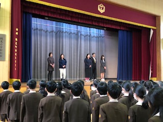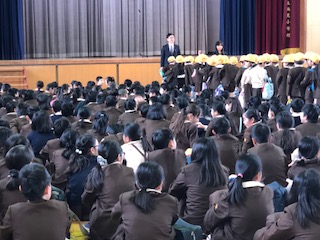 今日は、始業式の前に着任式が行われました7名の先生が着任され6名の先生が退職・転任されました。その後、始業式が行われました。校長先生からは、正門横の石に彫られた「正しく・強く・明るく」のことを大切にしていこう話がありました。