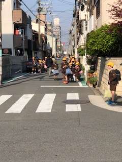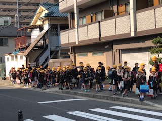 集団登校風景です。1学期の始めよりみんなきちっと集団登校ができています。今年は8時15分から20分の間にはほとんどの児童が登校できています。4月の学校の目標は「チャイムの合図を守ろう」です。登校時刻も守れて、しっかりできています。