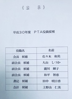 平成30年度PTAの役員公示行われました。メンバーは上記の通りです。4月25日15時30分より小学校にてPTA決算総会・予算総会が行われます。ご参加下さい。