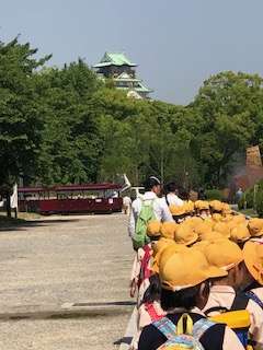 > 2年生校外学習。いい天気になりました。9時に学校出発して、先ほど森ノ宮駅につきました。今日は大阪城で、自然を満喫し、大阪城の歴史を学びます。午後からは天守閣に向かいます。