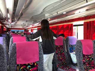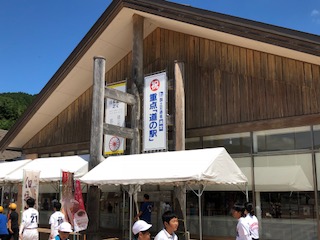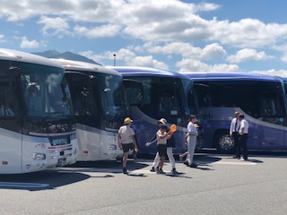 > 舞鶴自動道、道の駅まほろば到着です。渋滞もなく順調に進んでいます。ここでトイレ休憩です。林間学習に向かう学校のバスが20台は並んでいます。もちろんトイレも大混雑です。ここまできたら少しは涼しいかと思いましたが、強い太陽の日差しであまり気温差は感じません。 バスの中は、音楽を流し,それにのって大きな声でみんなが歌い大盛り上がりです。