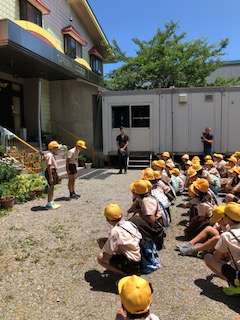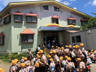 予定通り11:30 ハチ高原グリーンロッヂに着きました。開舎式を行いました。児童代表の挨拶の後、館の方から「大阪では味わえない自然を満喫しましょう。こちらも例年より暑いので熱中症には充分注意しましょう。」の挨拶がありました。そのあと、学級写真を撮って、入館です。
