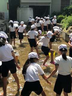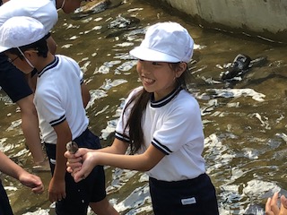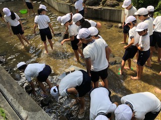 やまめ、アマゴなとのつかみ取りを行いました。このためにビーチサンダルを用意してきています。冷たい水に入り、ご機嫌です。ただヌメッとした魚を捕るのは苦手な児童が多く歓声?のあがりっぱなしでした。