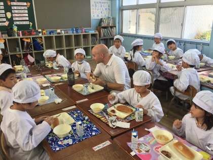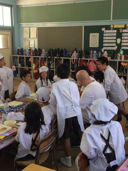 8月29日、1年1組に、5.6年生に英語を教えているアダム先生が、給食を食べに来てくれました。初めは、何を話していいのか分からないようでしたが、アダム先生が、全員の名前を聞いてくださったことから、どんどん話が広がって、最後は、先生を囲んで盛り上がっていました。来週は、1年2組です。楽しみですね。