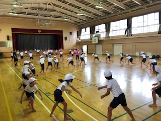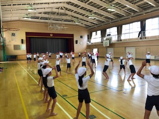 応援団の練習をしています。運動場が雨で使えなかったので、今日は体育館です。太鼓の音に合わせて体育館いっぱいに響き渡るよう、声を合わせて本番に向けて頑張りました。