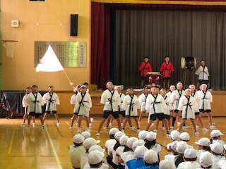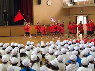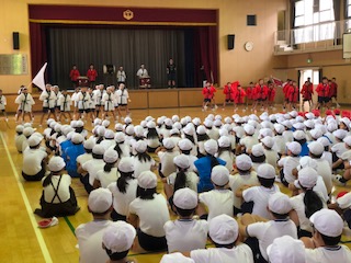 今日は、昨夜からの雨で運動場が使えませんでした。1時間めは、体育館で応援練習をしました。応援団と全学年での応援合戦はとても迫力のあるものに仕上がりました。