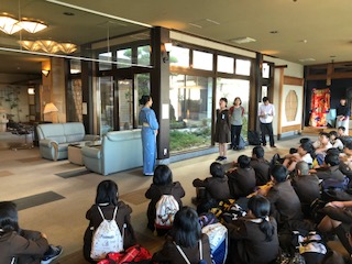 16:00 パークホテルみち潮に到着ました。宿の方と入館式を行いました。とても見晴らしの良い高台に建つホテルです。大阪市の小学校他2校も同宿です。ホテル挨拶の後ペッパー君が宿利用の説明をしてくれました。