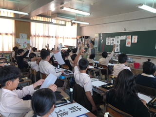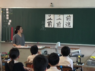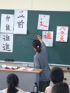 5年生の午前中は1.2組それぞれ2時間書写の授業を外部から講師を招き行いました。鈴木桃麗先生です。筆の整え方墨つぎの仕方をはじめ、丁寧に筆法まで教えていただきました。「前進」シンニョウば難しいでしたが筆をおこして書く事で少しは良くなりました。