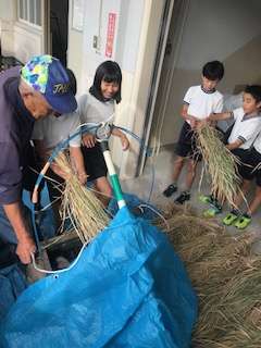 10月24日(月)の5,6時間目に地域の東さんと1学期から育ててきたお米の脱穀体験をしました。