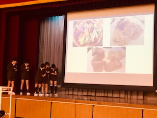今週は給食週間です。この週間にちなんで、児童集会で食事の大切さや給食のありがたさなど、普段何気なく口にしている食について考えました。寸劇の中でクイズを出題し、楽しく学びました。最後には私たちのために毎日作ってくださる給食調理員さんに感謝をし寸劇の幕を閉じました。