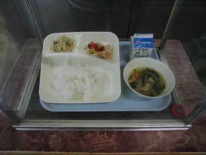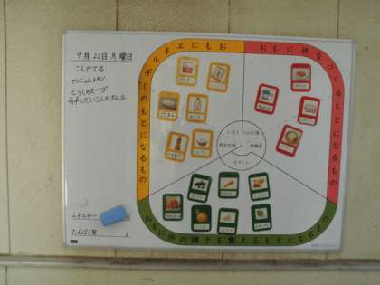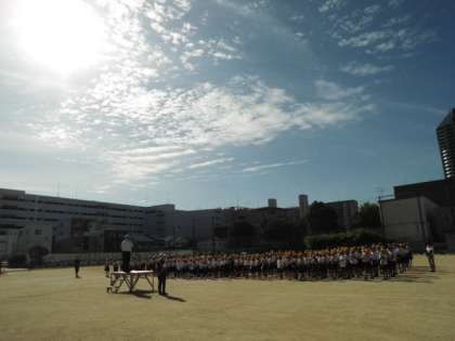 写真1 久しぶりの涼しい朝で、秋空の下全校朝会を行いました。