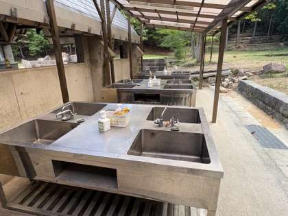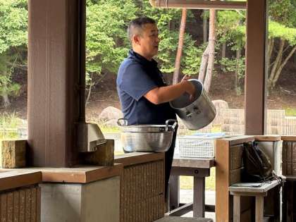 薪割りも上手にでき、これから野外炊飯の始まりです。宿舎の方からカレーつくりの説明を受けています。お家でつくる時との違い、特にかまどを使って調理をするので、火傷をしないように注意をしていただいています。みんな真剣に聞いています。出来上がりが楽しみです。みんなで協力して美味しいカレーをつくりましょう。