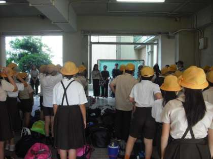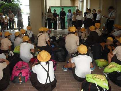写真1、2 出発式  しっかりお話を聞きいていました。