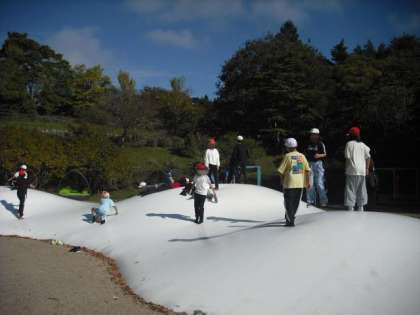 写真1 雪のようですが、ふわふわ跳ねる遊具です。子どもたちは元気に飛び跳ねていました。