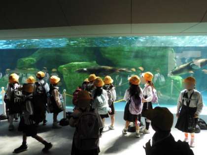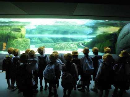 水中動物のコーナーです、上から眺めた動物の水中での様子を観察し、とても興味をもって観察していました。