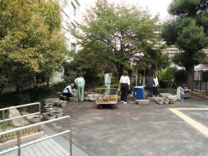 写真1 PTA苗・球根うえ 正門前に多くの方で作業していただきました。きれいな花が咲くことを楽しみにしています。