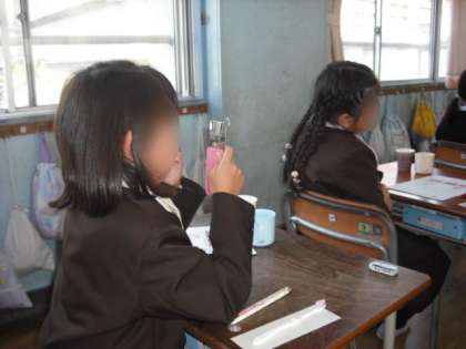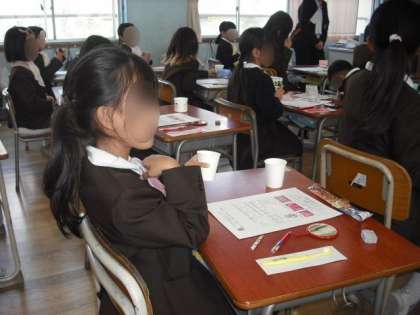 教育委員会より歯科衛生士さんに来ていただき、歯垢を赤く染めて観察したあと、鏡を見ながら上手な歯磨きの仕方を練習しました。