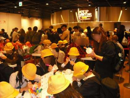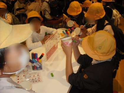 写真1〜3 まずカップヌードルの容器に思い思いに絵を描いていきました。