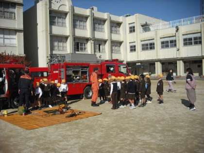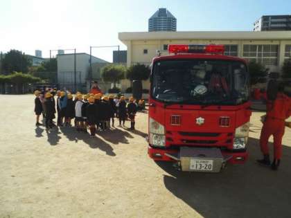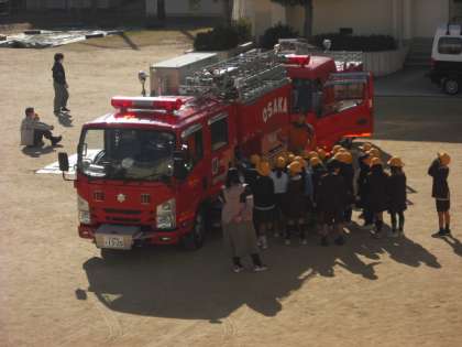 本物の消防車や、装備品の説明がありました。子どもたちは興味津々でした。