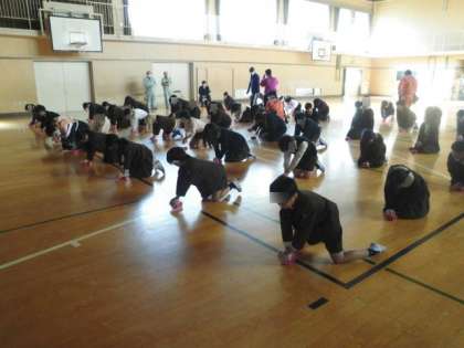 大型スクリーンに映し出される映像で説明を受け、心肺蘇生術(心臓マッサージ)等の練習をしました。