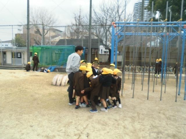 冬の柔らかな日差しの中、子供たちは寒さに負けず全力で駆け回っています。