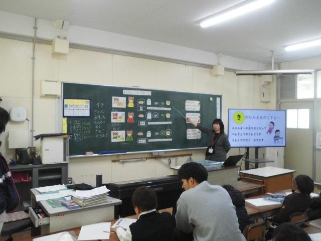 今日の2時間目、1年生は栄養教諭の先生と一緒に「食」についてのお勉強をしました。