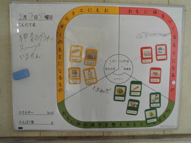 今日は、コッペパンと牛乳に「主食は押麦のグラタン」とスープという洋風献立でした。