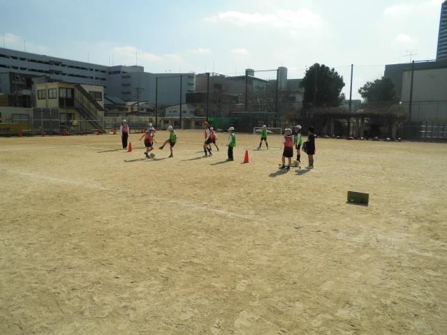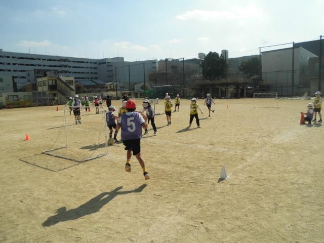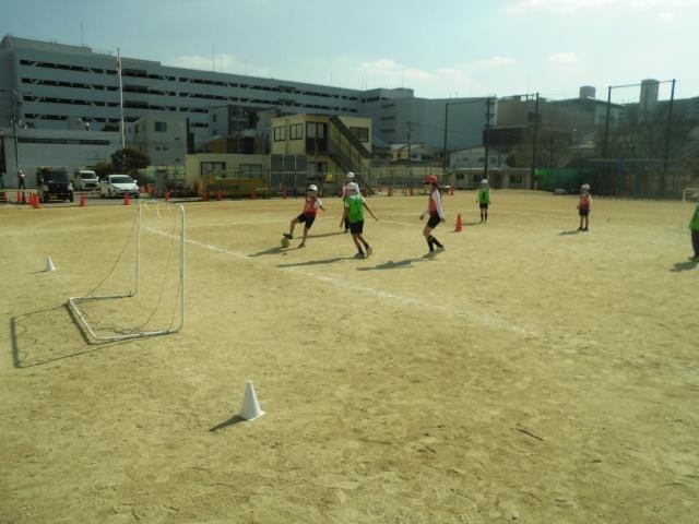 そんな暖かな日差しの下、運動場では3年生が体育の授業で「ミニサッカー」に取り組んでいました。